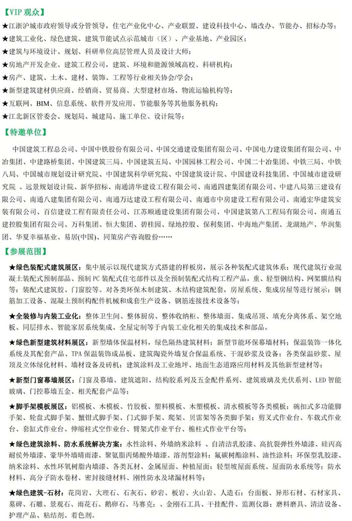 中國(南通)國際綠色建筑建材產(chǎn)業(yè)博覽會(簡稱:GACME南通綠色建博會)據(jù)悉,目前展會招展工作已進入收官階段;德州海天、廣聯(lián)達科技股份、江蘇吉潤、浙江億洲、凡林建科、廈門市鑫宏華、比姆泰客、陜西普石、山東三英、河北華鯤、興化市華成、揚州新晶、南通樂佳、萬鴻雙喜集團、任丘市金獅焊接、廣州景興、常熟風范、多維綠建、亞聯(lián)河北、任丘市鑫晨、江蘇利信、山東金力、任丘市博盛等多家業(yè)內(nèi)知名企業(yè)將紛紛亮相,以展示企業(yè)最新產(chǎn)品、招商政策等。
