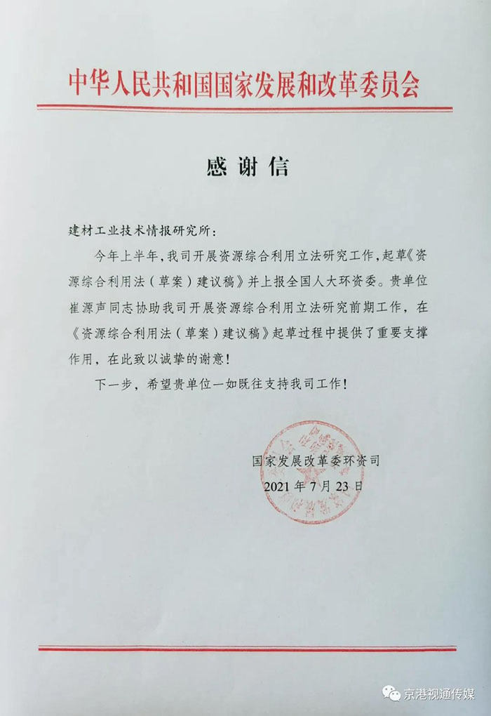 7月23日,國(guó)家發(fā)展改革委環(huán)資司發(fā)來(lái)一封感謝信,信中對(duì)建筑工業(yè)技術(shù)情報(bào)研究所首席專家兼中國(guó)綠建進(jìn)出口產(chǎn)業(yè)聯(lián)盟主席崔源聲同志在《資源綜合利用法(草案)建議稿》起草過(guò)程中做出的努力給予肯定并表示感謝。詳細(xì)內(nèi)容如下:
