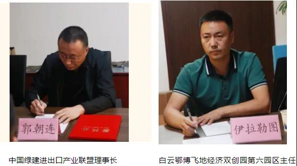 情報(bào)所·中綠建進(jìn)出口產(chǎn)業(yè)聯(lián)盟理事長(zhǎng)郭朝連與白云鄂博飛地經(jīng)濟(jì)雙創(chuàng)園第六園區(qū)主任伊拉勒?qǐng)D雙方代表簽訂了戰(zhàn)略合作協(xié)議。
